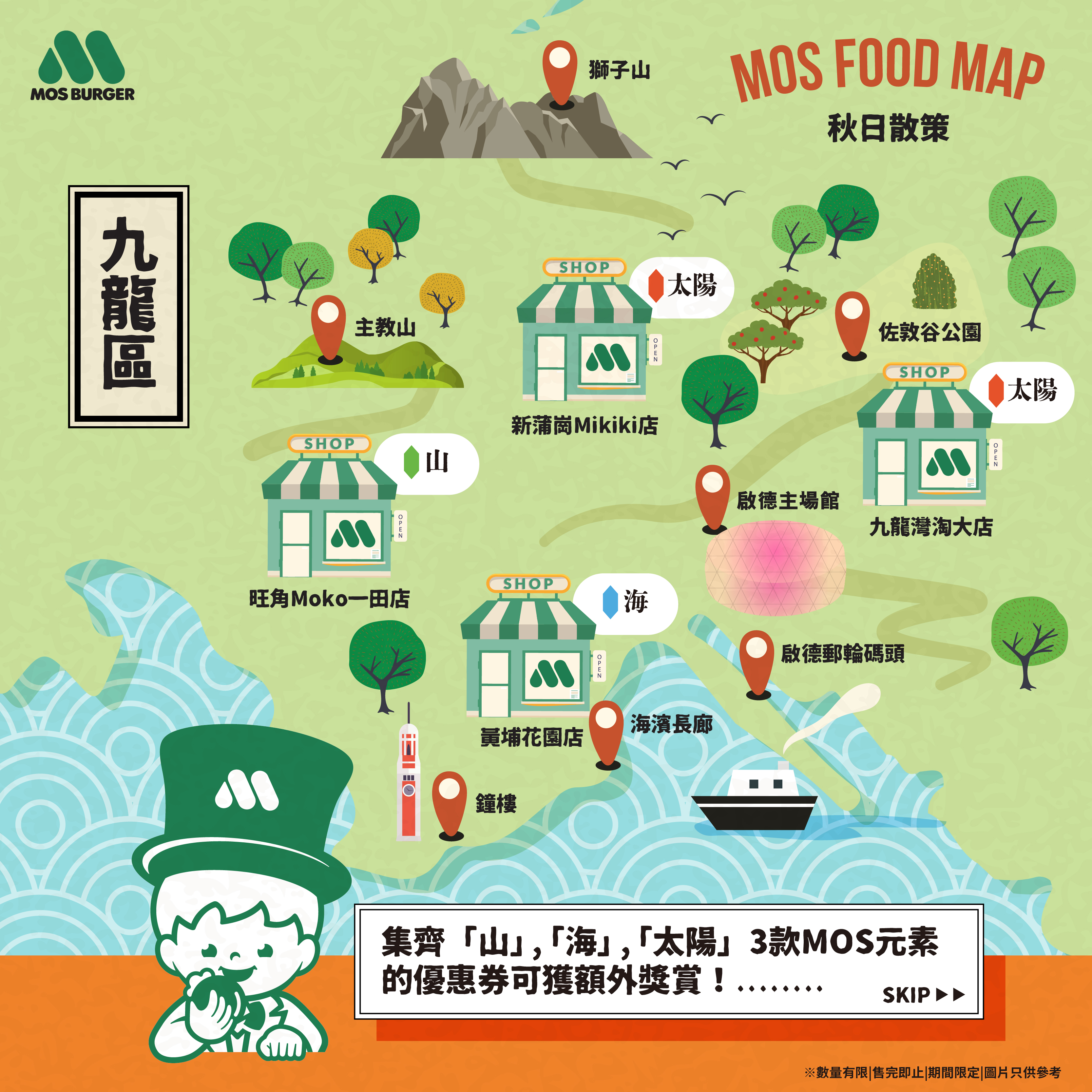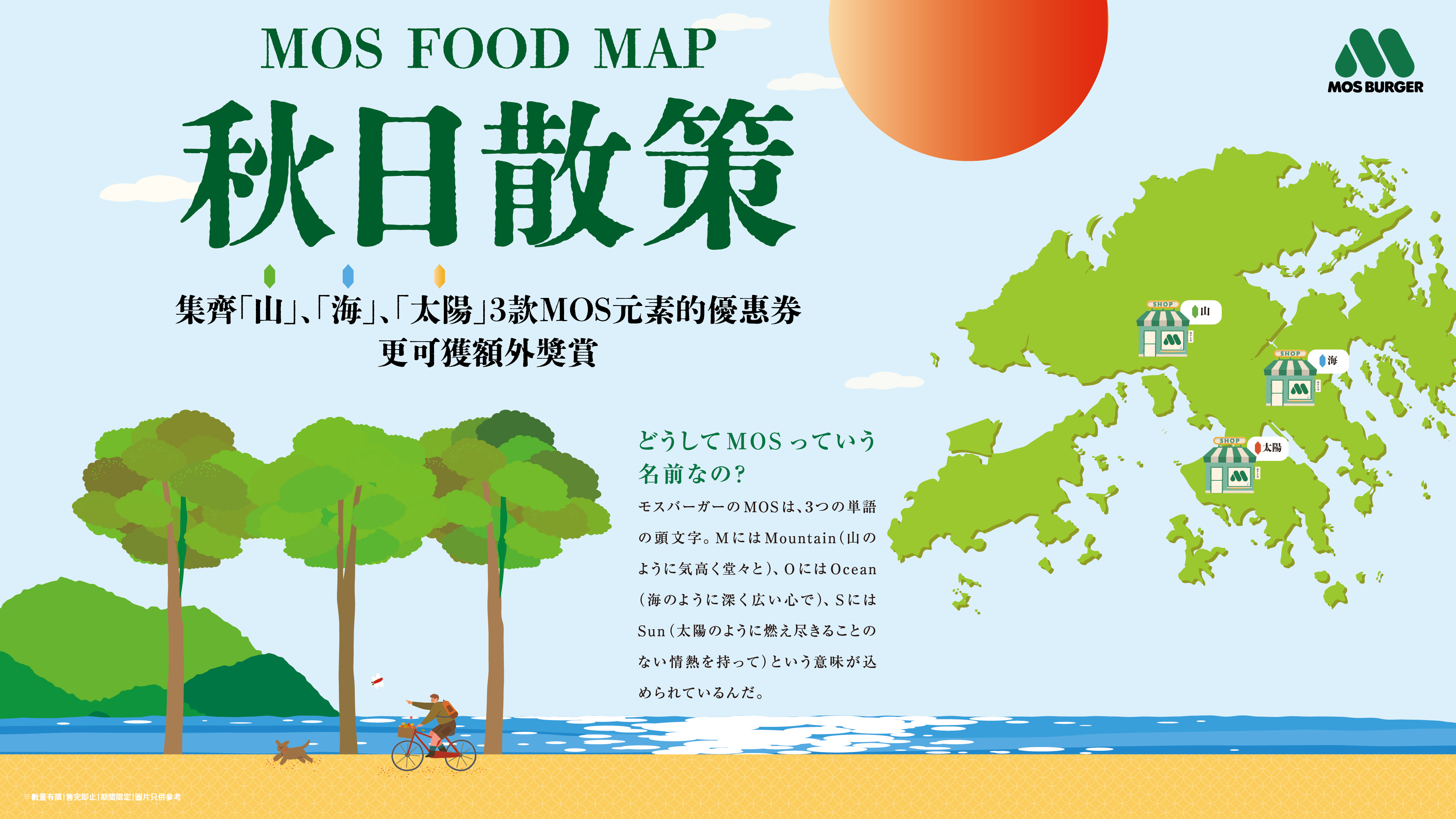 我哋準備咗「山」、「海」🌊、「太陽」共3款MOS元素APP優惠券,散佈喺14間指定分店!